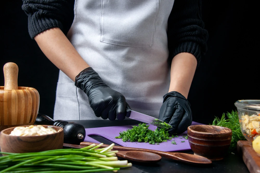 Die HYGOSTAR Einmalhandschuhe in Schwarz, Größe 9/L, sind die perfekte Wahl für den Einsatz in der Küche und im Lebensmittelbereich. Hergestellt aus hochwertigem Nitril, bieten sie hervorragende Reißfestigkeit und schützen zuverlässig vor Ölen, Fetten und anderen Flüssigkeiten. Die latexfreien Handschuhe sind besonders hautfreundlich und reduzieren das Risiko allergischer Reaktionen. Dank ihrer hohen Griffigkeit und Beweglichkeit ermöglichen sie präzises Arbeiten, während das elegante Schwarz professionell und hygienisch wirkt. Ideal für den täglichen Einsatz in der Gastronomie und Lebensmittelverarbeitung.