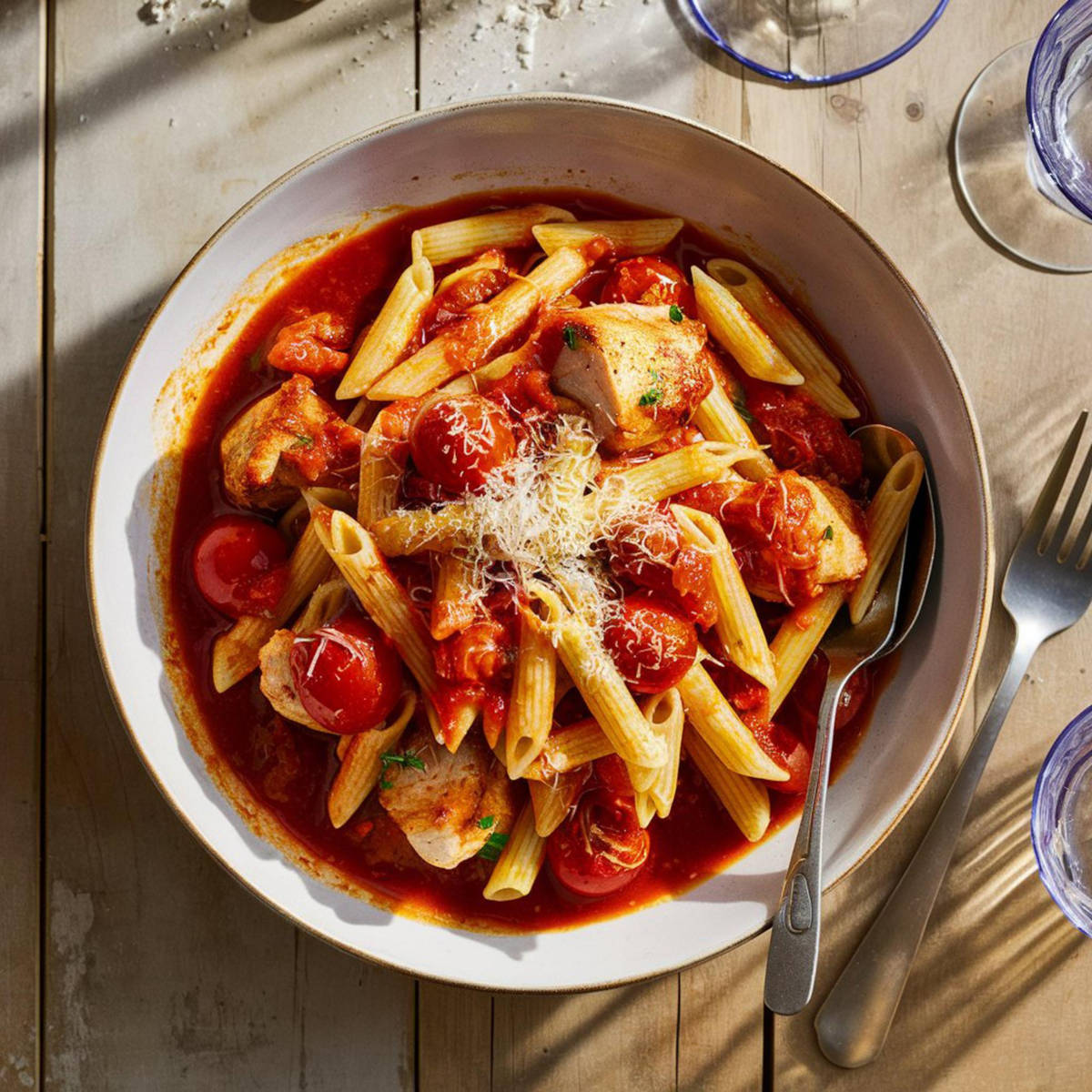 - Klassiker: Koche deine Lieblingspasta al dente und mische sie mit der Arrabbiata-Soße. Garniere mit frisch geriebenem Parmesan und einem Zweig Basilikum.