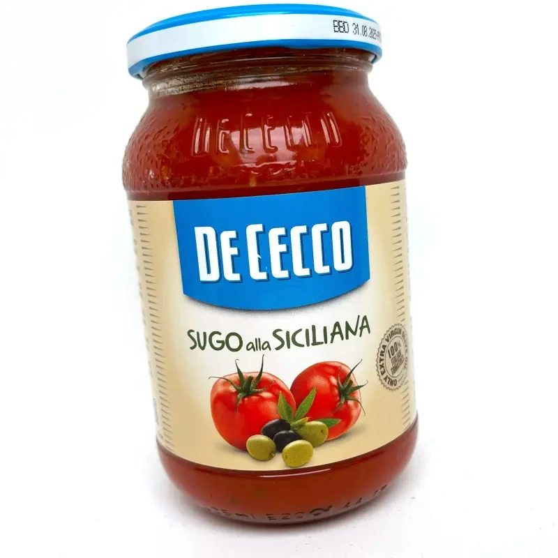 Du möchtest Dir in wenigen Minuten ein Stück Sizilien auf den Teller zaubern? Der Sugo alla Siciliana von De Cecco macht’s möglich: Fruchtige Tomaten, aromatische Oliven und ausgewählte Kräuter verschmelzen zu einer Sauce, die so schmeckt, als hätte sie stundenlang auf dem Herd geköchelt.